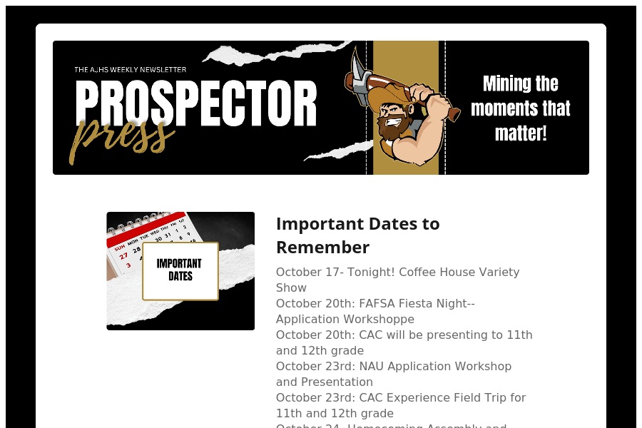 September Update September 2, 2025 Prospectors, There has never been a more exciting time to be a Prospector! At Apache Junction High School, we are proud of the momentum our students, staff. . .
